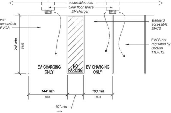 11B-812.6.1 Van accessible. Vehicle spaces serving van accessible EVCS shall be 144 inches (3658 mm) wide minimum and shall have an adjacent access aisle complying with Section 11B-812.7.